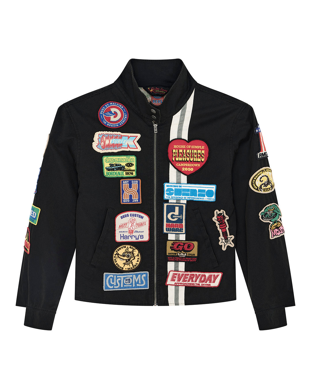 Veste légère à la coupe décontractée, avec des appliqués brodés sur le devant, le dos et les manches. Son design est structuré par des rayures verticales sur l’avant et des poches plaquées, renforçant son esprit workwear.